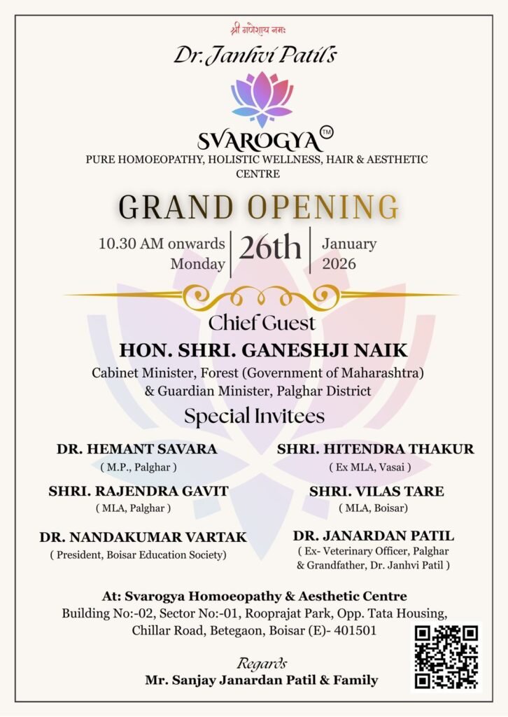 बोईसर (पूर्व) येथील बेटेगाव परिसरात डॉ. जान्हवी पाटील यांच्या ‘स्वारोग्य – शुद्ध होमिओपॅथी, समग्र आरोग्य, केस व सौंदर्य उपचार केंद्रा’चे भव्य उद्घाटन सोमवार, २६ जानेवारी २०२६ रोजी सकाळी १०.३० वाजता होणार आहे.